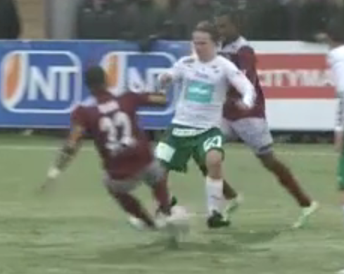 Onnistuin pysäyttämään kuvan aika sopivaan kohtaan.. Kyllähän tuo ilkeästi osuu, mutta en myönny väittämään, että nappulatedellä kahdenjalan taklauksesta olisi kyse. Ennemminkin paljon huonoa tuuriakin tuossa.