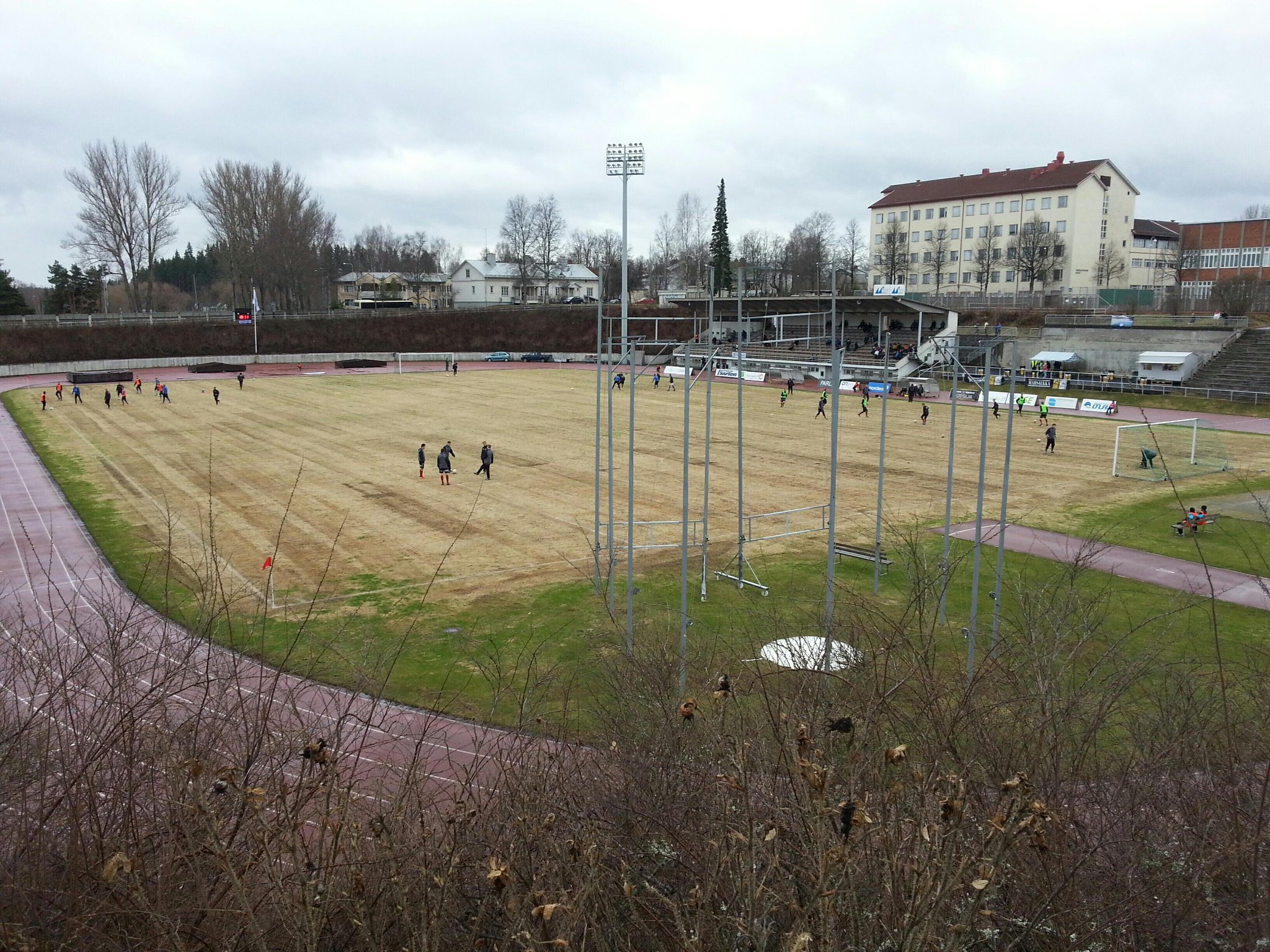 Mikkelissä Urheilupuiston kentältä on vasta harjattu viime vuoden jäänteet pois. Kulutusta kestävä jalkapallonurmi ei vielä näillä lämpöasteilla kasva.