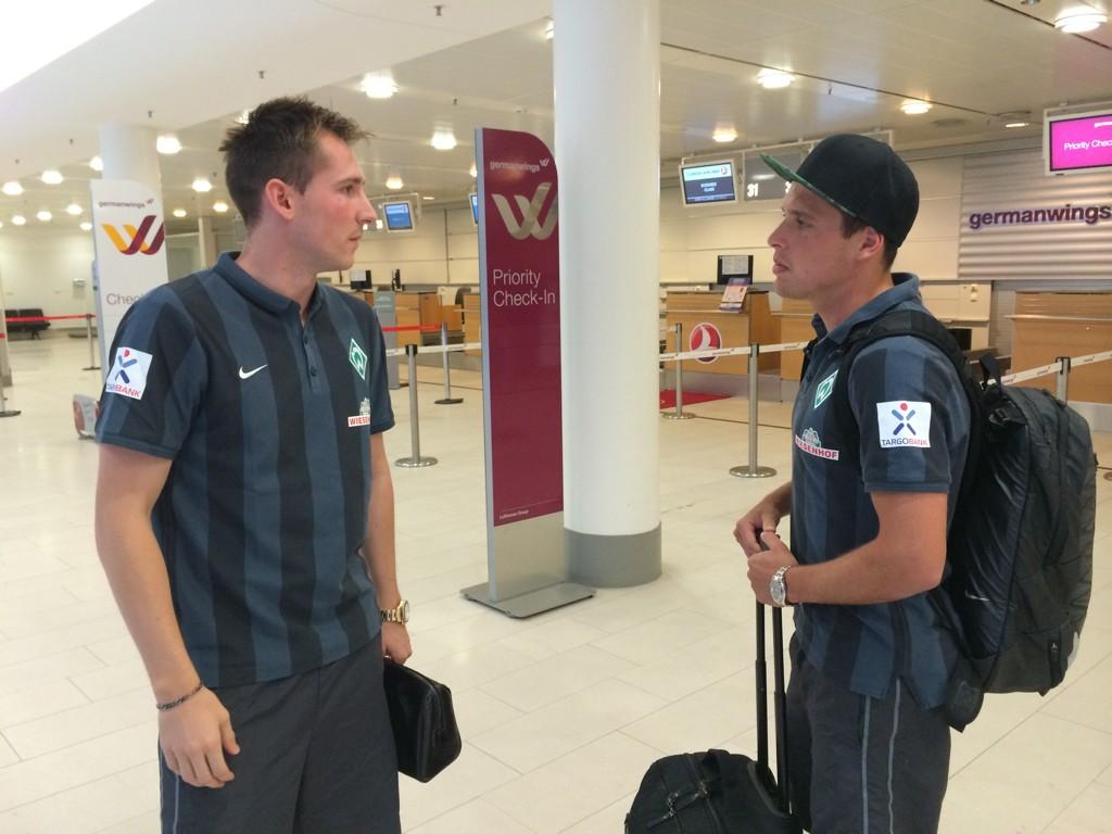 Belgiassa voisi kysyntää vielä ollakin. Varmaan Werder maksaisi siinäkin tapauksessa osan palkasta, kuten Schmitzille. Zillertaliin treenileirille lähdettäessä Latko (oik.) teki rohkeasti tuttavuutta uuden tulokkaan kanssa:  Toivottavasti kentällä meininki on vähän sulavampaa. Galatasaray sitten tosiaan vaatii Hajrovicille pelikieltoa ja kaiken maailman vahingonkorvauksia sopimusrikkomuksen takia. Hyvin epätodennäköistä kaiketi on, että mitään seuraamuksia enää tulisi, mutta tuskin se nyt ainakaan helpottaa Izetiä keskittymään peliin.