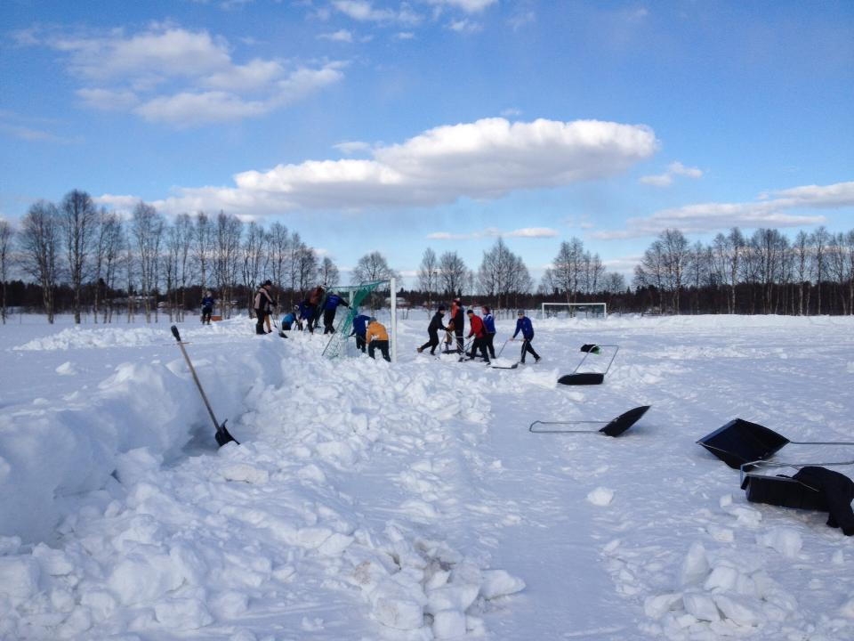 Kuten Kuusamossa tekivät. Kentällä riittävän paljon lunta vaikka traktorilla pinta putsattu. Kunta ei kentälle kuitenkaan enempää olisi tehnyt, eihän sitä oltu laitettu kauden jälkeen siistiksikkään (maalit verkkoinen hujan hajan kentälle jätetty)...