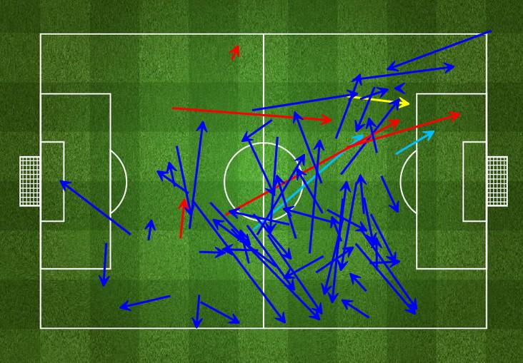 Maestron heatmap ja syöttökartta päivän pelistä.  Messin vaikutus summattuna yhteen kuvaan. Neljä vastustajaa keskittyy Kirppuun, samalla Suárez hiipii taustalla...
