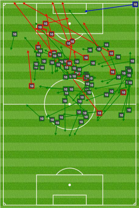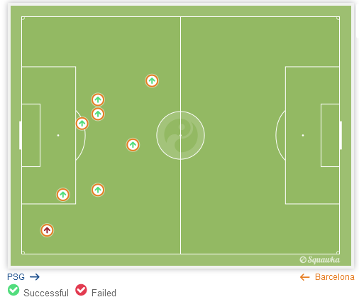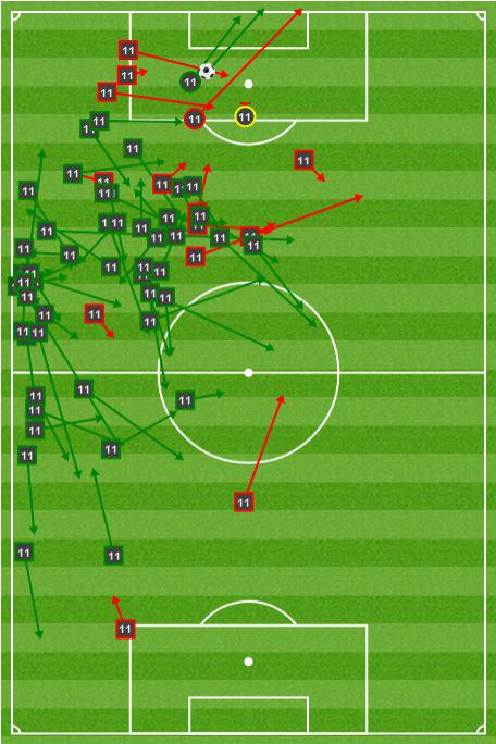 1-3 vierasvoitolla toinen jalka on tosiaan jo välierissä, mutta toinen osaottelu pitää silti pelata vielä tosissaan, joskin vastustajaa väsyttäen ja palloa halliten ilman välitöntä ja ehdottoman pakottavaa tarvetta iskeä itse osumia. Verrattin paluun myötä PSG pystynee pitämään toisessa osassa paremmin palloa itsellään... PSG pystyi hyvin kyllä eilen purkamaan Blaugranan prässin ja etenemään laidoilla, mutta Barcelona oli lähtenyt hyvällä asenteella liikkeelle ja usein tuplasi/triplasi PSG:n pallollisen pelaajan vierailijoiden puolustuspäässä. PSG odotetusti (poissaolot) ei pystynyt itse kovin pitkiin hallintajaksoihin, vaan iski muutamaan otteeseen vaarallisesti vastaan. Mascheranon liuku ekalla puoliajalla katkomaan Cavanin syöttö, ter Stegenin huikea refleksipelastus 0-2 johto-osuman jälkeen ja lisäajalla Mathieun uhrautuva liuku Cavanin vedon eteen. Tärkeissä paikoissa oltiin teräviä ja lopulta PSG pääsi luomaan vain pari vaarallista maalintekopaikkaa. Ranskalaisten maalikin syntyi paikasta, jota ei kaikella kunnioituksella voi vaaralliseksi vetopaikaksi kutsua. Väitän, että tämä peli voitettiin Blaugranan erinomaisella puolustuspelaamisella... ... sillä hyökkäyspelaaminen ja pallollinen pelaaminen noin muuten oli ennemminkin sellaista "another day at the office" -tasoa täydellisen ilotulituksen ja vitosvaihteella pelaamisen sijaan. Etenkin Neymarin avausosuman jälkeen koko joukkue Kirpun johdolla vaihtoivat konservatiivisemman vaihteen silmään ja pyrkivät kontrolloimaan hutiloinnin sijaan. Maltti lopulta palkittiin toisella puoliajalla kahdella lisäosumalla. Mutta tämä joukkue - nykyinen Barcelona - on todella hyvä joukkue. Se on niin hyvä, että se pystyy päihittämään Euroopan kärkiseuroihin luettavan joukkueen vieraskentällä perusvarmalla suorituksella olkoonkin, että PSG:n poissaolot vaikeuttivat kotijoukkueen iltapuuhdetta entisestään. Busquets oli järkyttävän hyvä (11,25 joustua kilometriä oli Blaugranan eniten eilen). Eilen näimme yhden mustekalan kauden parhaista esityksistä. Oikeastaan esitys muistutti itse kutakin jälleen siitä, miksi Sergio Busquets on nimenomaan Barcelonassa pivote numero yksi ennen Javier Mascheranoa, niin hieno ja loistava jalkapalloilija kuin hänkin on. Mascherano pelasi niin ikään upean ottelun ensin topparina ja toisella puoliajalla Mathieun kentälle tulon myötä keskikentällä. Toisella puoliajalla keskikenttä oli muotoa Busquets-Mascherano-Xavi(-Messi) ja pidin näkemästäni. Se toimi varsin dynaamisesti ja joustavasti eikä voitu puhua varsinaisesta tupla-pivotesta, vaikka Mascherano ja Busi samaan aikaan keskikentällä luutivatkin. Mascherano pelasi ylempänä.  Mascheranon syötöt eilen. Myös Piqué jatkoi vahvoja esityksiä, kuten myös Alba. Xavi toi kentälle väsynyttä vastustajaa vastaan toisella puoliajalla juuri sitä, mitä hän parhaimmillaan tuo. Maestro on nyt oikein peluutettuna tuoreilla jaloilla kuin uudesti syntynyt. Ilo silmälle. Sevilla ei ollut yhtä väsynyt lauantaina kuin PSG eilen Maestron tullessa kentälle, mikä puoltaa sitä, että isoissa peleissä Xavin on paras ottaa kentälle vaihdosta toisella puoliajalla avauspaikan sijaan.  Neymar iski tärkeän avausosuman hyvän liikkeen, haltuunoton ja sijoituksen myötä. Neljä onnistunutta kuljetusta, mutta muuten aika rutiini-ilta brassille.  Messi pelasi oikeastaan 10-paikan roolissa laiturin sijaan ja laski usein todella alas tukemaan pelinrakentelua, mikä on Blaugranan nykyisellä keskikentällä Kirpun suuntaan enemmän vaade kuin pyyntö pelin toimimisen kannalta (viime kesän MM-kisojen jatkopeleissä Messiltä nähtiin vastaavalaista joukkueensa pelin kokonaisuuden eteen uhrautumista). Tämä tietenkin tarkoittaa sitä, että Messi itse saa vähemmän maalintekopaikkoja, mutta se ei ole ongelma, mikäli ylempänä pelaavat Suárez ja Neymar iskevät omistaan sisään, kuten eilen. Vasemmasta kuvasta voidaan huomata Kirpun off-form -päivä syöttöjen suhteen, sillä lähes jokainen eteenpäin suuntautunut syöttö hyökkäyspäässä meni harakoille. Kuljetuksien osalta meni puolestaan paremmin, kuten oikeasta kuvasta voi huomata: 7/8 pelaajien ohitusta onnistui ja suurin osa niistä vielä lähellä vastustajan boksia, missä kuljettaminen on lähtökohtaisesti haastavinta. Maalisyöttö oli tärkeä, samoin pelillinen panos kokonaisuudessaan, sillä pääasiassa Kirpun ja Busquetsin avulla keskikentällä pidettiin pallo hallussa. Parilla edellisellä kaudella eilisen kaltaisen Barcelonan olisi pystynyt eliminoimaan yksinkertaisesti pitämällä alas laskenut Messi tarkasti merkattuna ja luottaa siihen, että hänellä on huonompi päivä. Eilen juuri näin kävi, mutta sillä erotuksella, että Neymar ja etenkin Suárez saivat Kirpun ylimerkkaamisen myötä 1vs1 -tilanteita, joita etenkin urugualainen voitti ja joista hän lopulta rankaisi surutta. Mahtavaa.