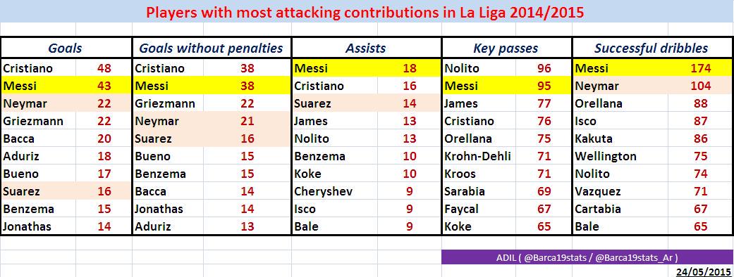 Yllä hyökkäyspään pelaajien merkittävimpiä tilastoja top5-liigoissa kauden 2014-2015 osalta. Huomioitavaa: Lionel Messi on ainoa pelaaja, joka mahtuu kymmenen parhaan joukkoon maaleissa (kera ja ilman pilkkujen), maalisyötöissä, maalipaikkojen luomisessa ja onnistuneissa kuljetuksissa.