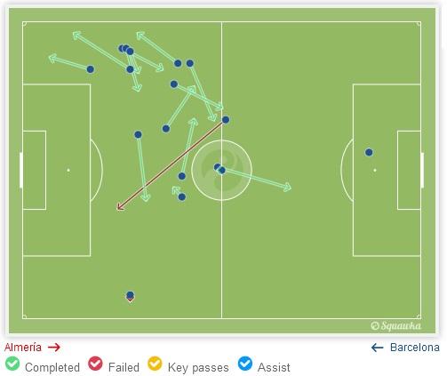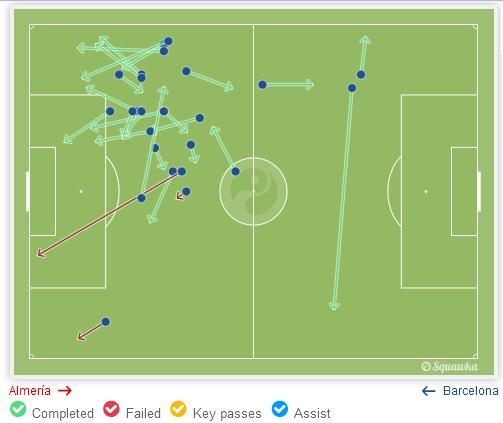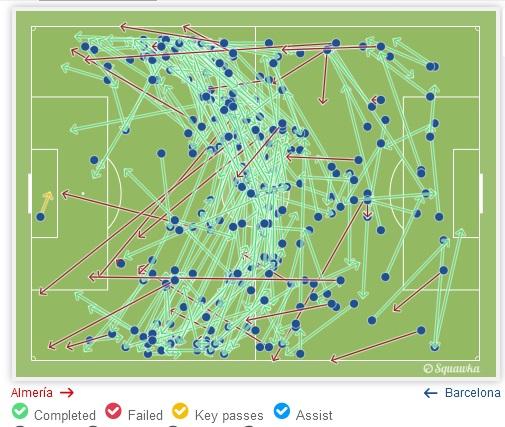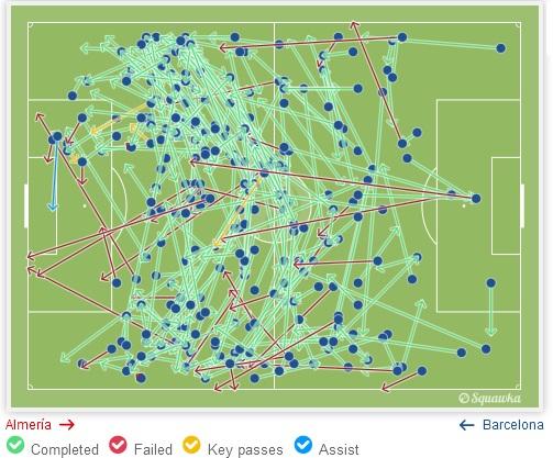 Huvittavintahan tässä on se, että esimerkiksi viimeksi eilen ja paljon myös Ajaxia vastaan Barcelona pelasi hyvin pitkälti sillä tavalla kuin sitä vastaan kyläseurat ja vähän suuremmatkin seurat ovat tottuneet vuosikaudet pelaamaan: Toppari vetää säännöllisesti pitkiä palloja hyökkääjälle kärkeen. Siten keskikenttä ohitetaan nopeiten ja jätetään kokonaan huomioimatta ja käyttämättä. Tällä tavalla toki riski keskialueella tapahtuvan pallonmenetyksen suhteen pienenee, mutta tämä ei ole silti se pelitapa, jolla Barcelona on totuttu näkemään ja menestymään. Paljon tulee mieleen Argentiinan maajoukkue, jossa Messi joutui pahimmillaan hyökkäyspelin osalta tekemään kaiken itse: Tuomaan pallon ylös eli käynnistämään hyökkäykset sekä päättämään ne. (Muuten Messin rooli eilisissä Barcelonan maaleissa toi kovasti mieleen Messin roolin MM-kisoissa jatkopeleissä lohkovaiheen jälkeen.) Silloin aina kyseltiin, että miksei Messi pelaa kuten Barcelonassa... Kohta kysellään, että miksei hän pelaa kuten maajoukkueessa...  Pelaajien keskimääräinen sijoittuminen Almeríaa vastaan. Silmiin pistää massiivinen tyhjä tila Masceranon, Rafihan ja Rakiticin välissä. Tuon tilan Almería tukki eikä Barcelona pelannut sitä kautta käytännössä ollenkaan. Lisäksi nyt ei keskikaistaleelta löytynyt edes sitä Messiä ja Busia, kun Messi pelasi enimmäkseen laidalla ja Busi valui toppareiden tasolle avaamaan peliä. Vaan kyllä tuo keskikenttä silti ällöttää. Sillä kaikesta huolimatta maalipaikkoja ei luoda joukkuepelillä vaan Messi hakee pallon alhaalta ja juoksee sen hyökkäyskolmannekselle ja syöttää Suárezille boksiin. "Messi heitä byyri" ei kuulosta miltään taktiselta neronleimaukselta Lucholta. Vaikka tällä pelityylillä raavittaisiin jotain mestaruuksia, on se silti paskaa, ja ei takuulla ota pelaajistosta kaikkea irti.