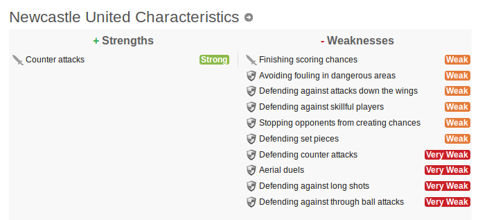 http://www.skysports.com/football/news/11678/10171412/newcastle-forward-aleksandar-mitrovic-suffers-knee-injuryJahas. Nyt se on vissiin sitten Doumbian näyttöpaikka... Saiko mitään fiilistä äijästä, kun pääsi Chelseaa vastaan lopussa kentälle? Edellisestä matsista on kulunut yli pari kuukautta ja edellisestä maalista neljä kuukautta aikaa, että ihan totaalise sokeaa uskoa ei täältä suunnalta löydy. Jos osoittautuu uudeksi flopiksi niin onhan tuolla vielä Papiss jossain reserveissä ja tietty Ayoze.  Pläräilin whoscoredia joutessani ja kylläpä muuten kuvastaa hyvin tämän hetken ongelmien laatua tämä arvio rakkaan seuran vahvuuksista ja heikkouksista