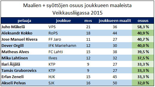 Mäksän twitterissa puolestaan mielenkiintoinen tilasto. Maali+syöttö osuus vepsun maaleista melkein 60%