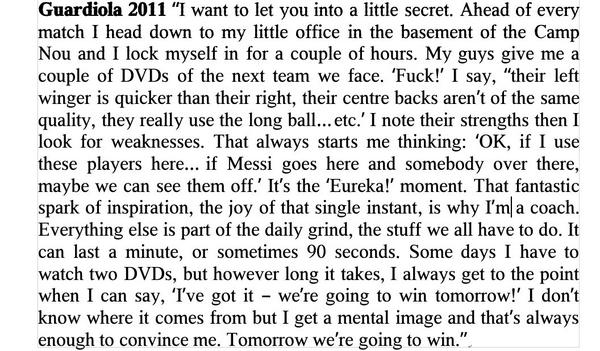 Ihan samaa minäkin kyselisin ja voisiko nämä lyhyiden projektien erikoismiehet listata ne nyky jalkapallon Alex Fergusonit tänne kiitos eli varmaankin niiden pitkien projektien valmentajat. Laitetaan nyt vaikka Thierry Henryn kommenttia Guardiolasta::: “Training sessions were never long, not even in pre-season, but everything was done at an intensity of 2,000 per cent,” "We trained the way we were expected to play, giving every drop of energy and paying so much attention to detail." "Stay in your position, trust your team-mate on the ball, and wait for the ball. Look at where I am [hugging the left touchline]. That position allowed [Andres] Iniesta to get the ball [in central midfield] because I’m occupying the right-back." Basically from training to the game, up until the last third, he [Guardiola] used to call it the ‘three Ps’ - play, possession and position. And the most important one was position. You have to stay in your position, trust your team-mates and allow the ball to come to you. “People always go on about how good Pep’s teams are on the ball, the tricks, the flicks and the goals. “What they don’t mention is the attention given to defending and all the work involved in getting everyone in the right place — and that was developed in training. “You were expected to run all the time. If you had a break in training to get a drink, you had to run to the sidelines and run straight back on to the pitch. “There was no mucking around and no room for egos. The players had to carry the goalposts on to the pitch because he wanted us to do everything as a team - and in double-quick time. “Pep was surrounded by superstars but kept them all on their toes by challenging them every minute of every day.” “In training, to make you understand that, especially for Xavi and Iniesta, he would put cones [down] and up until the last third, guys who were playing on the right were not allowed to cross over to the left were not allowed to cross over to the right, and on the left you were not allowed to cross over to the right. But the last third was freedom for us.” " He used to say to us the first time he took the team, ‘my job is to take you up to the last third, your job is to finish it"