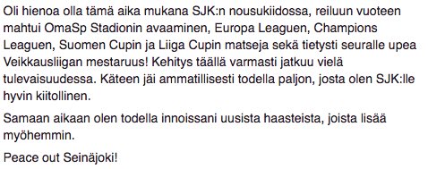 Markkinointipäällikkö Olli Lähdesmäki on irtisanoutunut SJK:n palveluksesta.