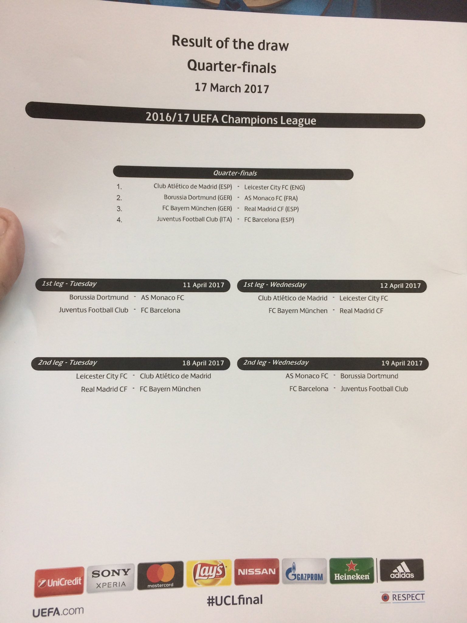 Hieno arvontatulos! edit: Välierään etenevät Athletico, Barcelona, Bayern ja Monaco.