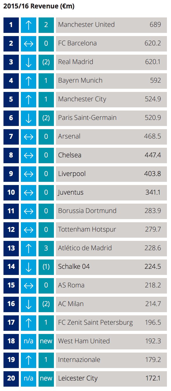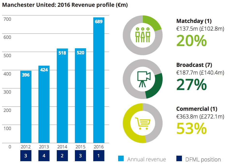 United on muuten palannut liikevaihto-tilastoissa paalupaikalle. http://www.bbc.com/sport/football/38655480  Sinäänsä hauskaa, et nää Unitedin lukemat riittäs suomessa yritysrankigissa noin sijalle 75
