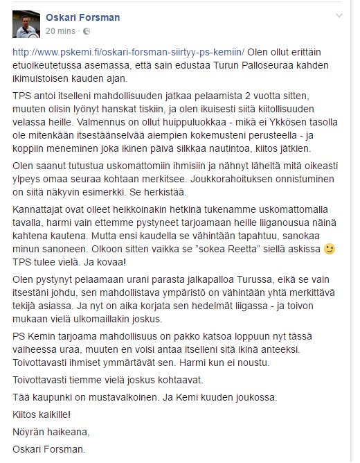 Onnea matkaan Oskarille. Mieshän tuolloin pari vuotta sitten ehti jo päivittää Twitteriin vai Facebookiin katkeransävyisenä, että ura oli tässä, mutta TPS:n sopparitarjous tuli tyyliin myöhemmin samana päivänä. Loistavat kaksi kautta meillä ja nyt liigajoukkueeseen, hieno fudistarina.