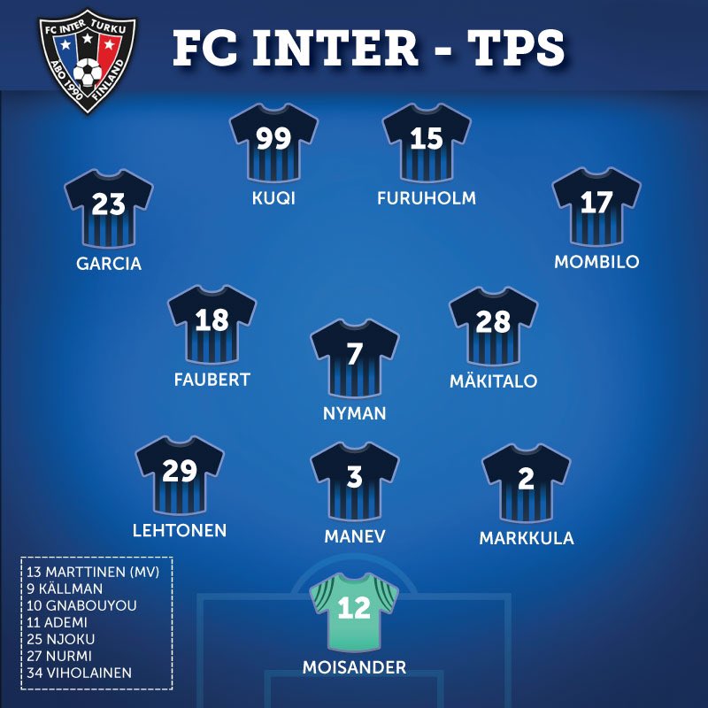12 Moisander Henrik 2 Markkula Niko 3 Manev Kosta 18 Faubert Julien 23 Garcia Lucas 28 Mäkitalo Mika 29 Lehtonen Henri 7 Nyman Ari 15 Furuholm Timo 99 Kuqi Njazi 17 Mombilo Kevin ------ 10 Gnabouyou Guy 11 Ademi Albion 9 Källman Benjamin 25 Njoku Philip 34 Viholainen Lassi 27 Nurmi Juho 13 Marttinen Aati