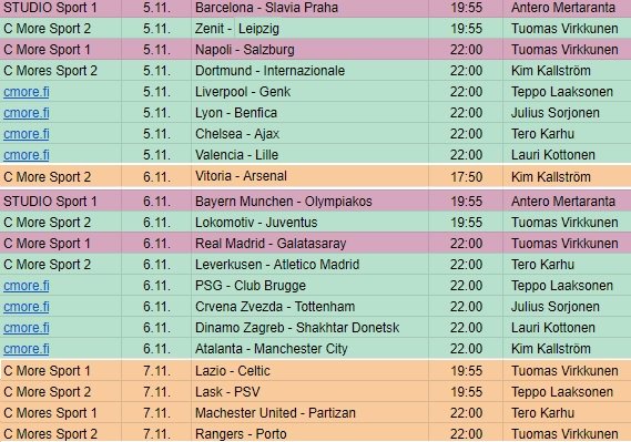 Barcelonassa ja Pietarissa mennään jo! Edit. Mestarien liigan 4. kierroksen ottelut ja selostajat, oranssilla merkityt ovat Eurooppa-liigaa.