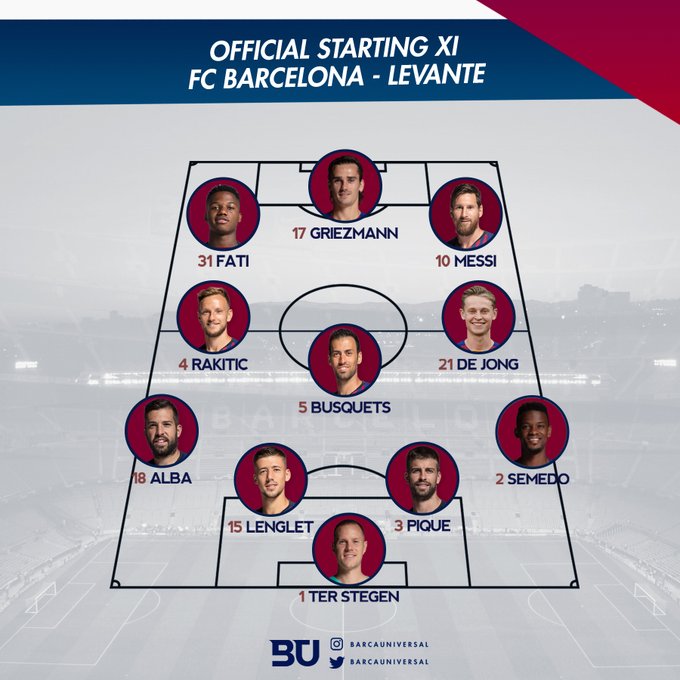 Jännä että Rakitic on taistellut itsensä nokkimisjärjestyksessä Arthurin ohi, toivottavasti brassi saa silti tänään peliaikaa. 4-3-3 tuntuu järkevältä ja mukavaa että Semedo taas avauksessa. Kun Dembele pian palailee, Fatille vähän lepoa.