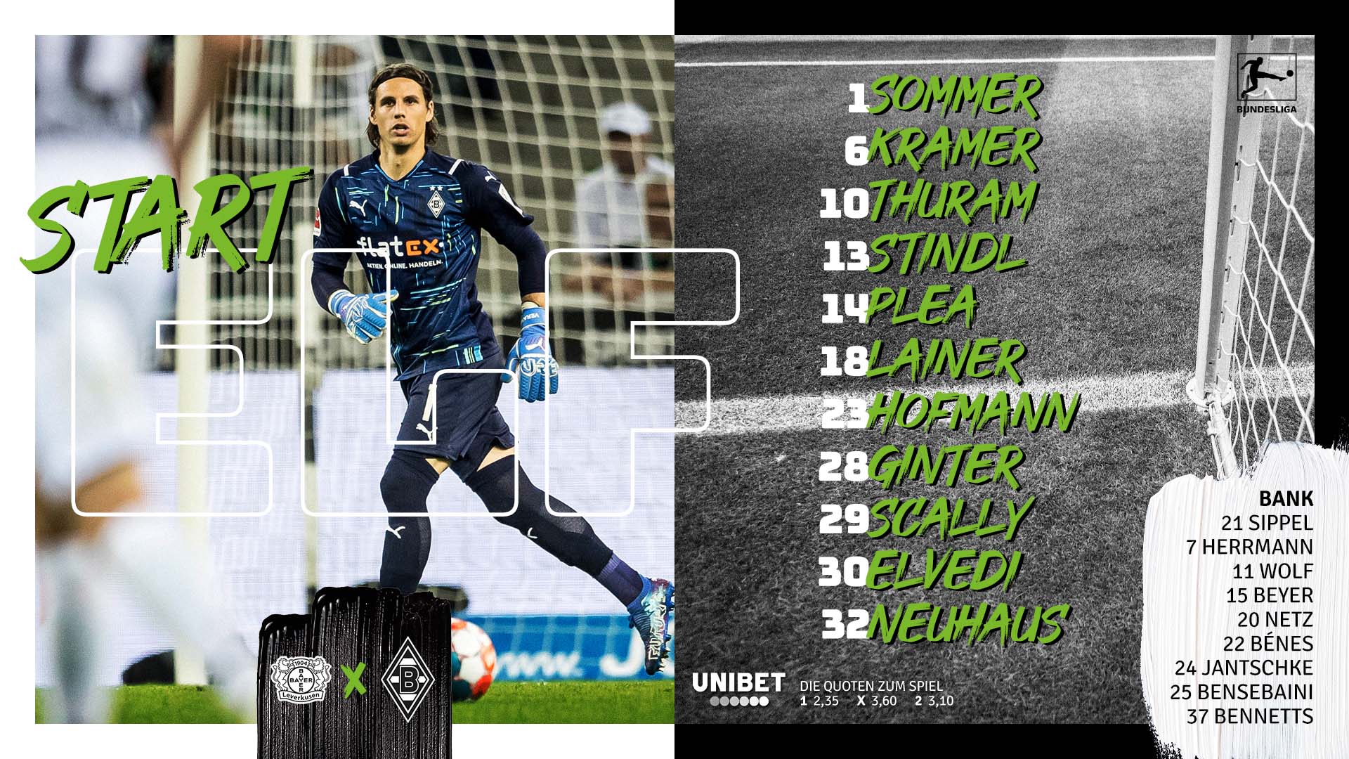 Jolle vähemmän yllättäen taas penkin puolella. Vieraiden kokoonpanosta huomionarvoista on se että Scally jatkaa avauksessa vaikka Bensebaini onkin jo pelikunnossa. Mainittakoon myös että Interiin huhuttu Thuram avaa, mutta Zakaria on kokonaan poissa kokoonpanosta. Sveitsiläinen toki sairasti koronan, mutta niinkään ois muutakin taustalla. Jollen tilanne jatkon kannalta on huhujen mukaan vielä auki, josko vaikuttaisi osaltaan peliaikaan?