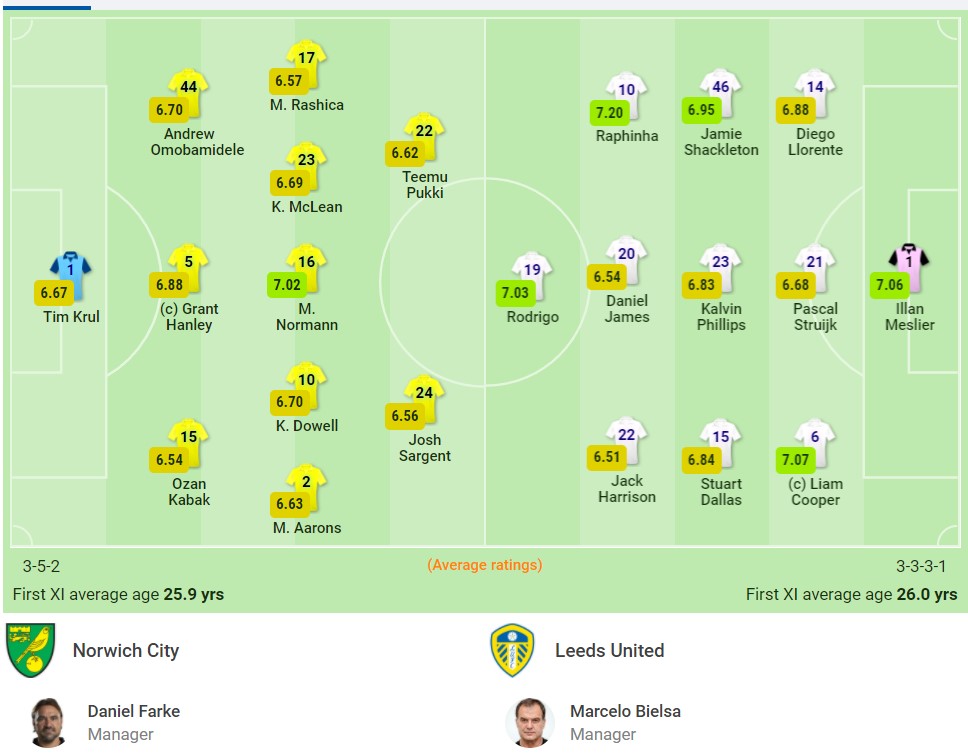 Leeds: Meslier, Dallas, Cooper (C), Llorente, Shackleton, Struijk, Phillips, Harrison, James, Raphinha, Rodrigo Subs: Klaesson, Cresswell, Hjelde, Drameh,Summerville, Forshaw, Klich, Roberts, Gelhardt
