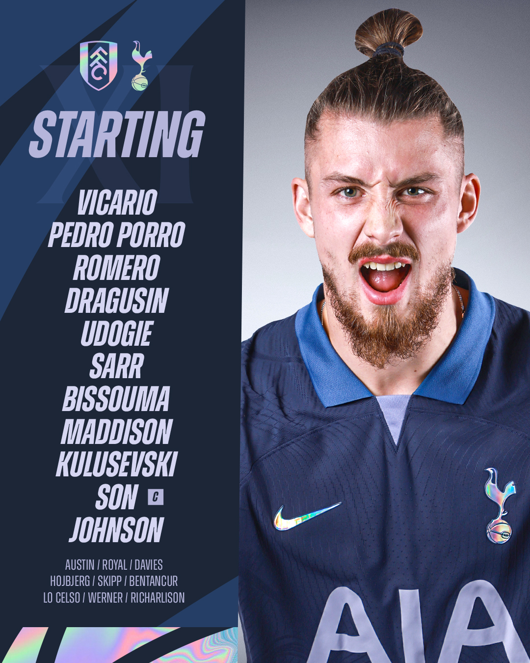 Spurs XI Vicario, Porro, Romero, Dragusin, Udogie, Bissouma, Sarr, Maddison, Johnson, Son, Kulusevski.