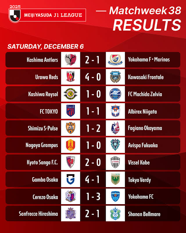 Reysol voitti Machidan lukemin 1-0, kun vierailijoiden puolustajasta pallo meni omaan maaliin. Tämä ei kuitenkaan riittänyt, sillä samaan aikaan Antlers voitti Leo Cearan kahdella osumalla F-Marinosin 2-1. Näin "peuroille" vuoden 2025 J1-liigan mestaruus, joka on seurahistorian yhdeksäs ja ensimmäinen sitten vuoden 2016. Kierroksen tulokset.  Sarjataulukko, Shonan Bellmare, Albirex Niigata ja Yokohama FC ensi kaudeksi J2-liigaan. Mito Hollybock ja V-Varen Nagasaki nousevat. J2-liigan kolmas eli JEF United nousukarsintaan.