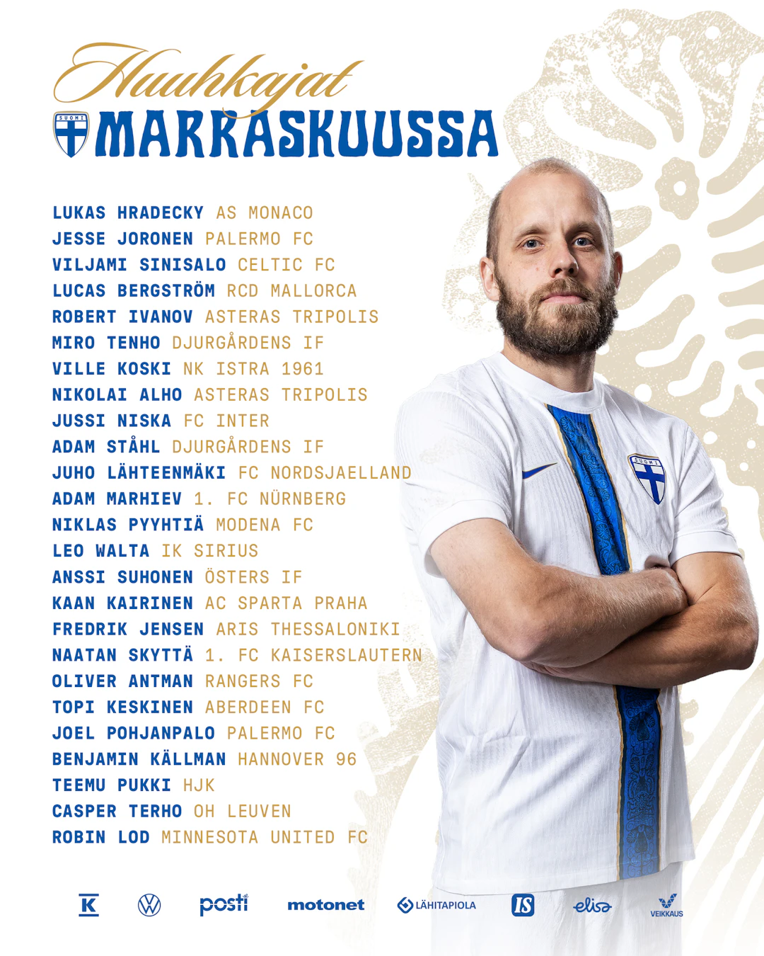 OUT: - Peltola (pelikiellossa) - Pikkarainen - Svanbäck - Uronen (loukkaantunut) - Väänänen (loukkaantunut) Ja toki OUT-osastolla myös Jukkola ja Miettinen, jotka valittiin alunperin lokakuussa mukaan, mutta joutuivat vetäytymään ennen leiritystä.