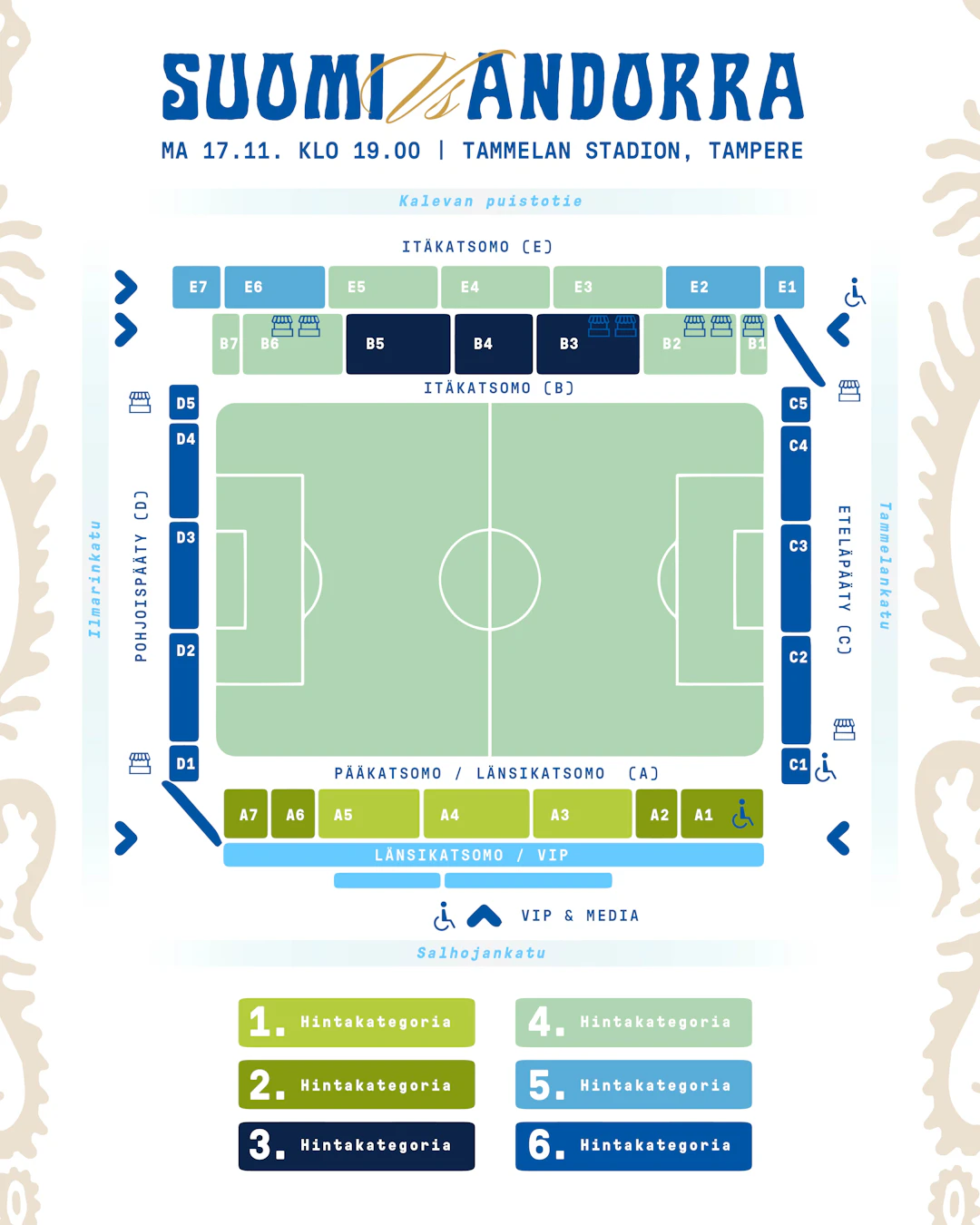 Suomen Maajoukkueen Kannattajien (SMJK) kannattajakatsomo: Lipunmyynti tapahtuu SMJK:n kautta kannattajayhdistyksen jäsenille. Lue lisää:
