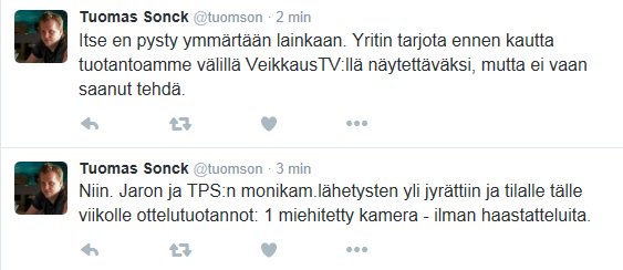mm. TPSTV on tarjonnut käytännössä ilmaiseksi laadukkaampaa monikameralähetystä, ei ole yhteistyö kelvannut. Tietääkö joku vastaako tuotannosta liitto (HuuhkajaTV) vai Veikkaus? Jos Palloliiton juttuja niin ei yllätä.