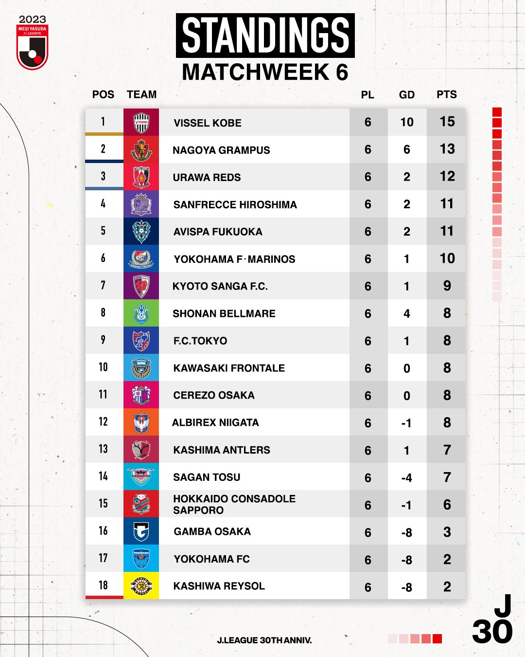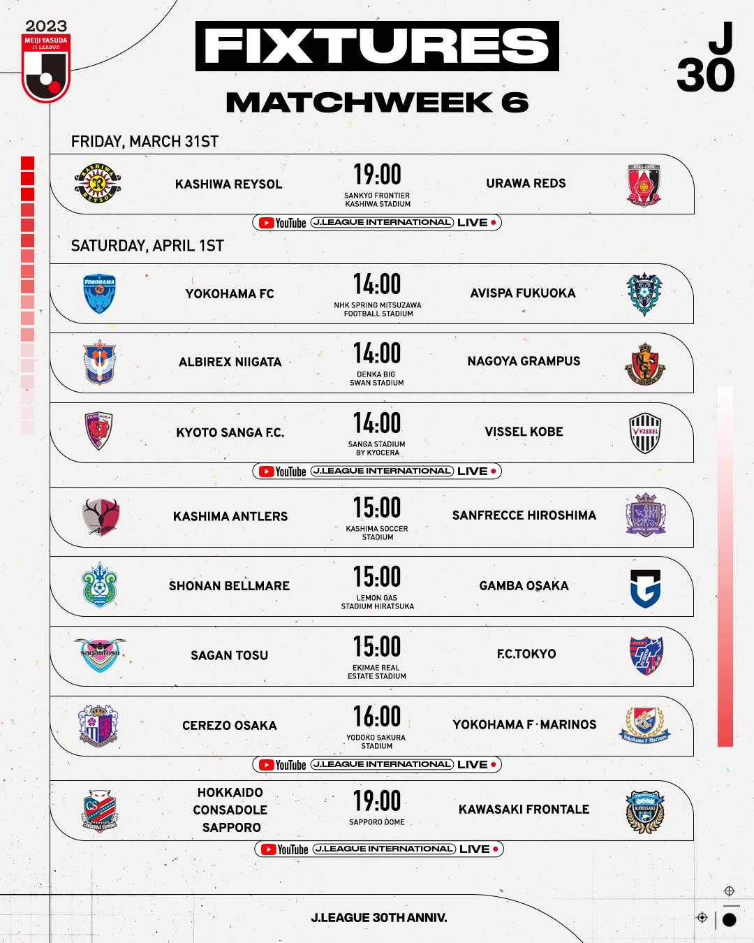 Nostetaan tämä ylös. Kautta 2023 on pelattu jo viisi kierrosta ja kuudes kierros potkaistiin käytiin Kashiwa Reysolin ja Urawa Redsin välisellä ottelulla. Sarjataulukko: https://www.jleague.co/standings/j1/2023/Viikonlopun ottelut.  J-League International-Youtube kanava näyttää neljä peliä kierrokselta suorina lähetyksinä. https://www.youtube.com/@JLEAGUEInternational