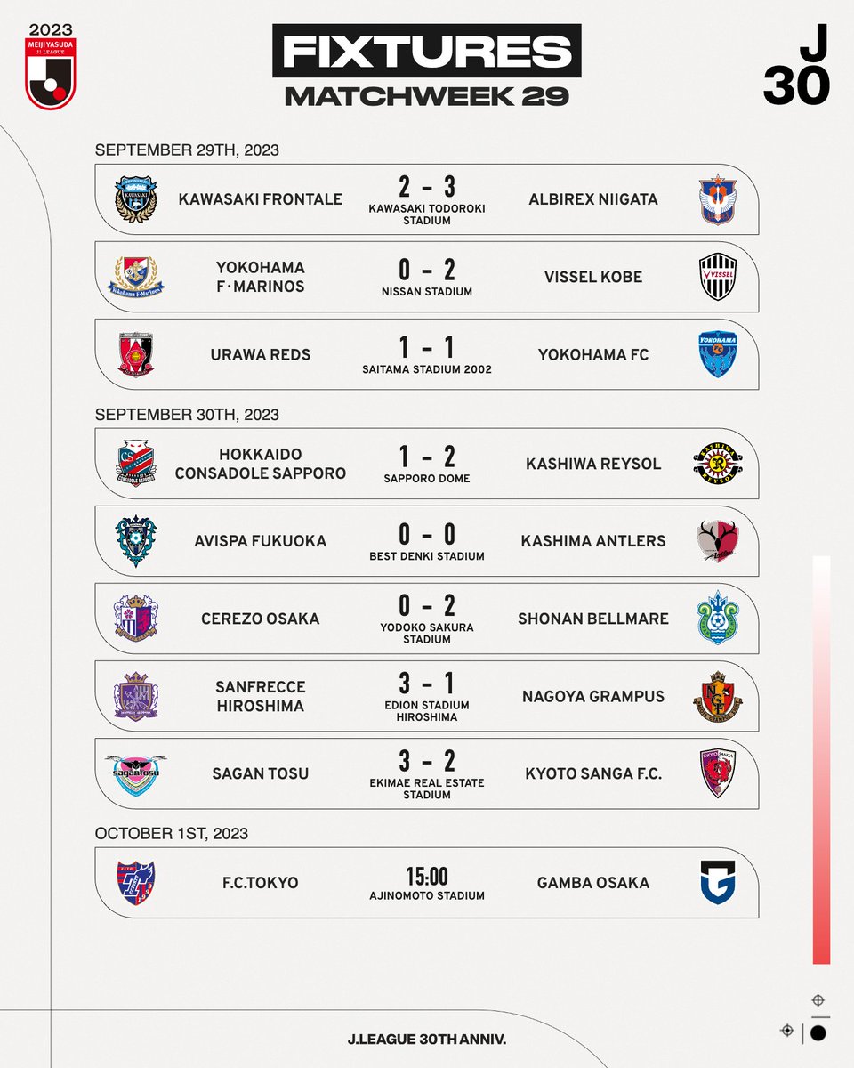 29. kierroksen tulokset. Fc Tokyo voitti Gamba Osakan 3-0.
