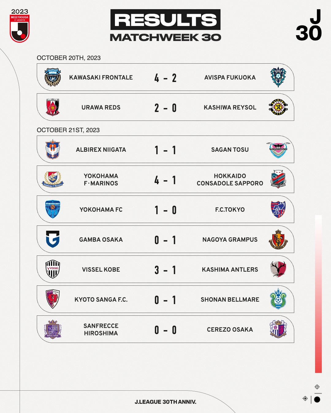 Kobe otti mestaruuden kannalta tärkeän 3-1 Kashiwasta. Hiroshimassa Sanfrecce ja Cerezo Osaka pelasivat maalittoman tasapelin. Nagoya katkaisi kuuden ottelun voitottoman putkensa ja F-Marinos voitti Consadole Sapporon 1-0. Maalikoosteet: https://www.youtube.com/@JLEAGUEInternational/videos