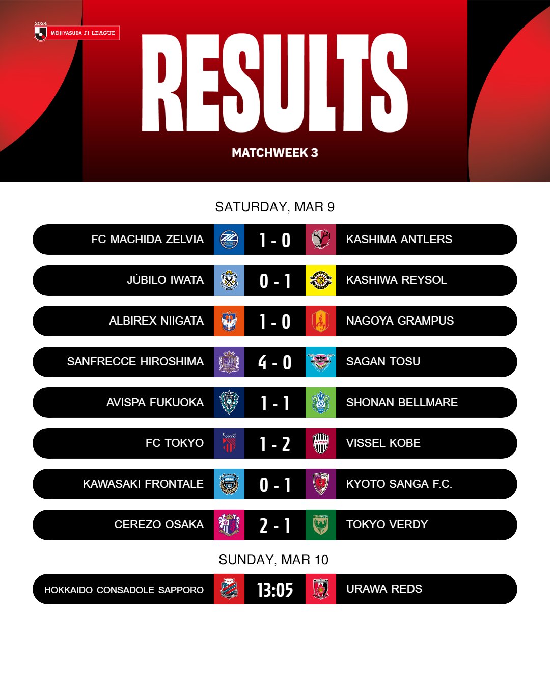 Kierroksen päättäneessä kamppailussa Urawa Reds voitti 1-0 vierasvoiton Consadole Sapporosta. Ainokaisen iski Hiroki Sakai.