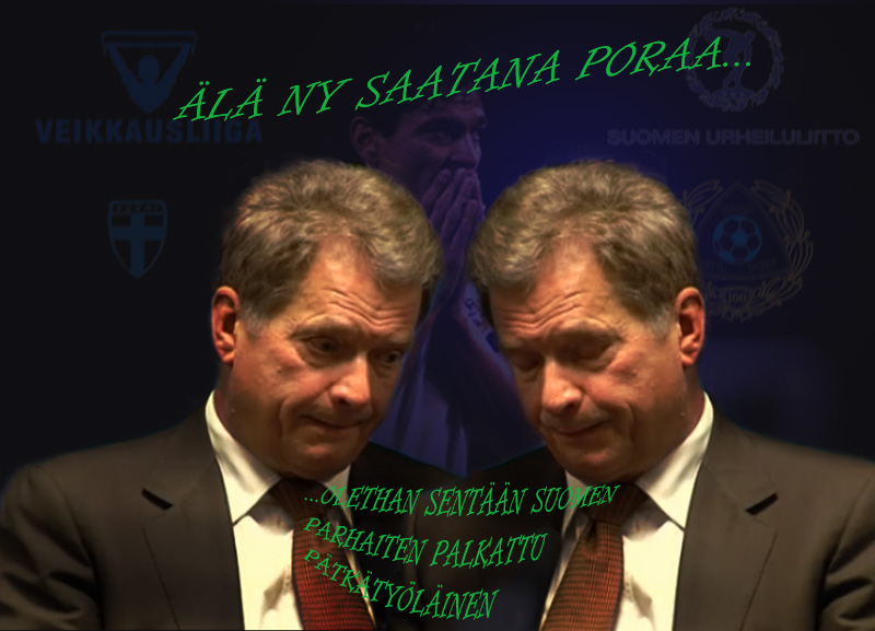 Eikö Niinistö jakanut mitalit cupin voittajille ja myös Suomen mestareille HJK:lle. Tässähän sitä meriittiä jo on; ei tuo kaikilta onnistuisi. Ja tämän lisäksi hän on jaksanut/ehtinyt katsoa myös Suomen maajoukkueen ottelut. Taisi lentää jopa ulkomaillekin. -Ei tämäkään kaikilta onnistuisi. Mitään muuta ei kyllä tule mieleeni...ai, niin kävi FC Lahden harjoituksissakin kesällä ja esitteli hienon kantapääkikan: telvisiossa ihan näytettiin. Niinpä...keulakuvaahan tässä haettiin, ei puheenjohtajalta mitään saavutuksia voi odottaa. Vai odotatteko, että Sale viisaudessaan ja kaikkivoipaisuudessaan nostaa Suomen peräti maailman kärkimaiden joukkoon. Ei; toivoa vain sopii, ettemme vielä tuolta sijalta 87 putoa alaspäin. Vaara on kyllä edessä, ellei...